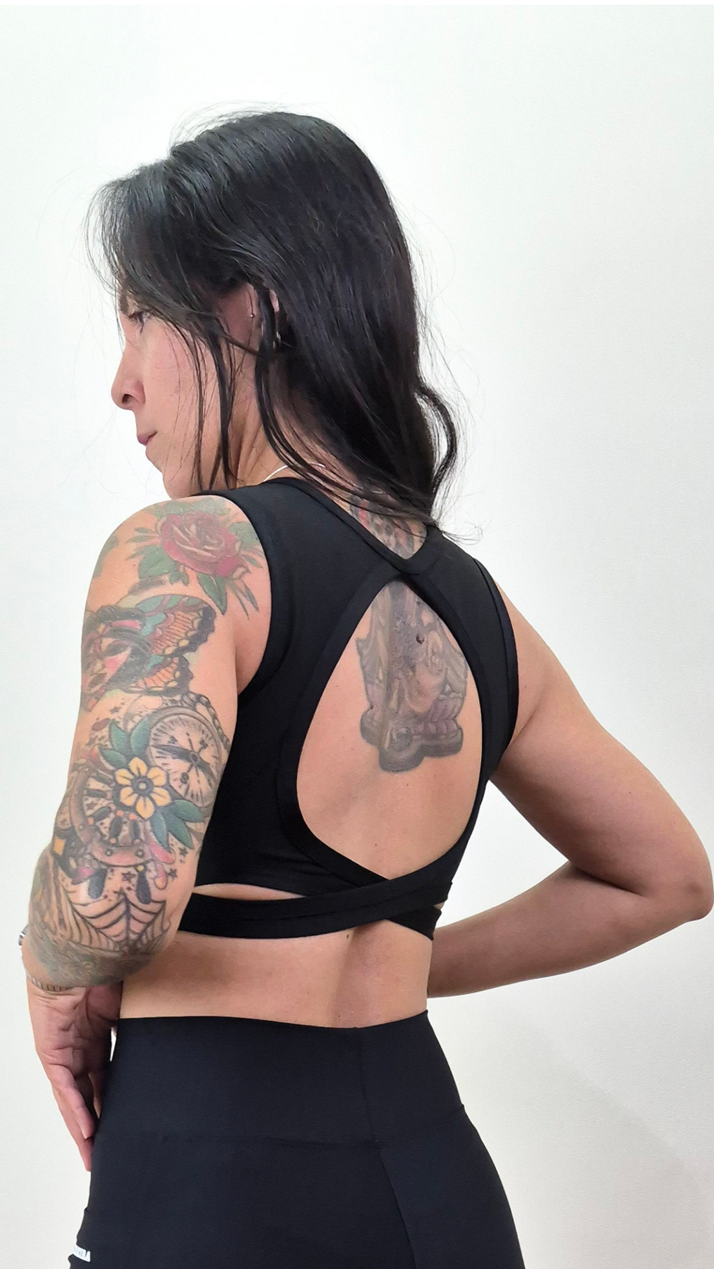 Seu design com decote em V e costas abertas com cós cruzado valoriza o corpo com naturalidade, enquanto as alças mais largas garantem sustentação e conforto, especialmente para quem tem seios maiores.
